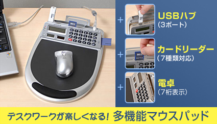 って事で目を付けたのがコレ:マルチマウスパッド(電卓・USBハブ・カードリーダー機能付) !