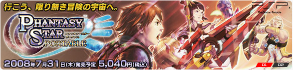 | 20年の歴史を誇るセガオリジナル大作RPG「ファンタシースター」シリーズの最新作「PHANTASY STAR UNIVERSE」がPSPに登場! その名も「PHANTASY STAR PORTABLE」 「PHANTASY STAR PORTABLE」は、「PHANTASY STAR UNIVERSE」の単なる移植作品ではありません。 開発に「ガンパレードマーチ」「式神の城」などの株式会社アルファ・システムを迎え、2つのモードが柱になる構成は変わりなく、まったく新しいストーリー、「イルミナスの野望」の新要素、携帯機用の仕様変更、バランス調整などを加えて再構成された、「新たなるPSUなのです! |